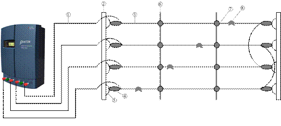 一台脉冲主机加上一定长度的前端围栏,便组成一个独立完整的周界防区。其导线的连接,应当遵循下列原则:一个防区为一个串接回路,自发射部分到前端围栏,再到接收部分,连接方式为串接,不得并联,不得分支。