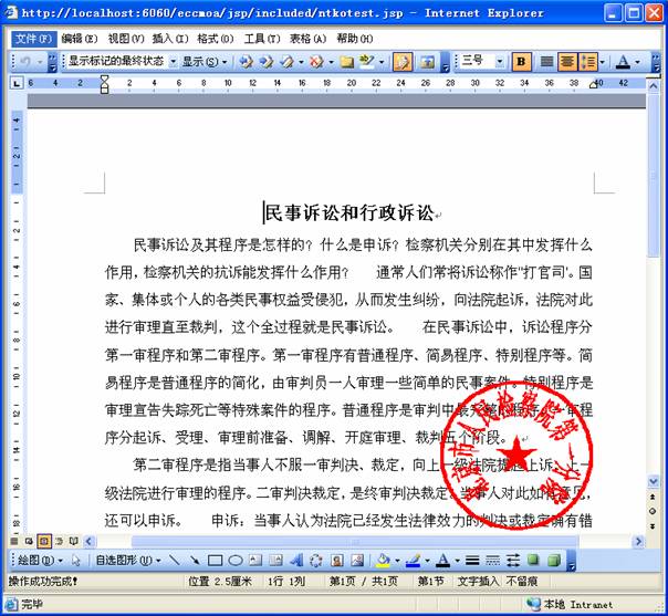 电子签章:用户在电子文件上盖章时需要输入用户名和密码,才能取得签章的使用权。盖过的章会和Word文件紧密结合在一起,从视觉效果上表现为签字印章的图像。并且盖章后能验证出文件的原文在传输过程中内容有无变动,如果文件被修改,原电子签章将自动作废,保证文件的完整和真实可靠性。