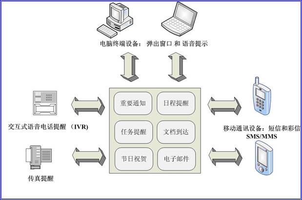 提醒系统支持用户待办工作、内部通知、会议通知等重要事件提醒、催督,支持提前提醒、循环提醒、定时提醒方式。包括邮件提醒、短消息提醒、桌面提醒、手机短信提醒。
