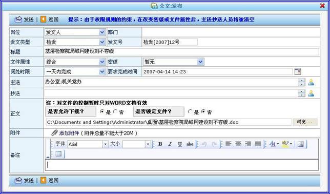 发文管理实现发文起草、公文审核、督察督办、发文痕迹保留、公文传阅、公文会审、来文登记等功能。支持多种文件格式,支持对纸质文件扫描录入,可以进行模板红头套用、打印文件和稿纸等功能。