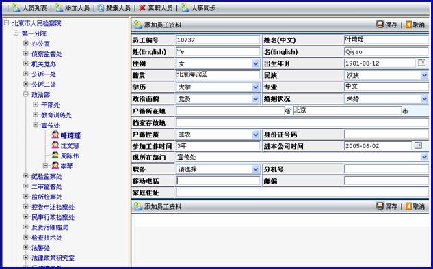 人事管理包括人事档案管理、培训管理、奖惩管理、考评管理、薪资管理、调动管理、统计查询等功能。提供了工作人员的信息录入、档案打印及相关的各类信息的维护功能。