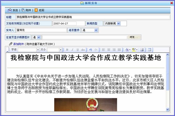新闻公告可编辑新闻并可与office组件进行集成,进行新闻的发布、修改、删除、查询和评论等操作。包括新闻类别管理、发布新闻、查看新闻等功能。